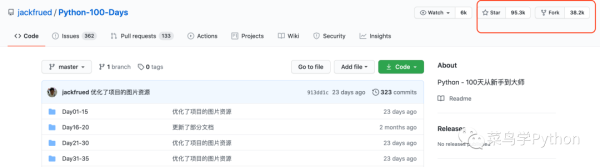 100天,让你从python小白变成python大师。这个项目是由中国同学骆昊开发的,从python的基础到语言进阶。还进行了GUI开发、计算机网络、Web开发、Linux操作系统、数据库、网络爬虫、数据分析、大数据等方面的内容教学,可谓是非常的全面了,要是大家能耐心的跟着学完这一套,对自己的能力是一种质的提升。
