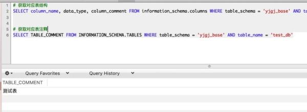 SELECT TABLE_COMMENT FROM INFORMATION_SCHEMA.TABLES WHERE table_schema = 'yjgj_base' AND table_name = 'test_db'