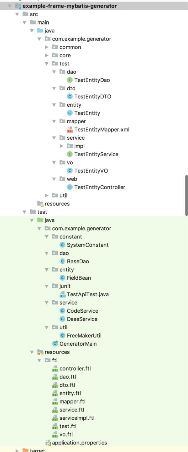 public class FreeMakerUtil { /** * 根据Freemark模板,生成文件 * @param templateName:模板名 * @param root:数据原型 * @throws Exception */ public void generateFile(String templateName, Map<String, Object> root, String packageName, String fileName) throws Exception { FileOutputStream fos=null; Writer out =null; try { // 通过一个文件输出流,就可以写到相应的文件中,此处用的是绝对路径 String entityName = (String) root.get("entityName"); String fileFullName = String.format(fileName, entityName); packageName = String.format(packageName, entityName.toLowerCase()); String fileStylePackageName = packageName.replaceAll("\\.", "/"); File file = new File(root.get("outUrl").toString() + "/" + fileStylePackageName + "/" + fileFullName); if (!file.getParentFile().exists()) { file.getParentFile().mkdirs(); } file.createNewFile(); Template template = getTemplate(templateName); fos = new FileOutputStream(file); out = new OutputStreamWriter(fos); template.process(root, out); out.flush(); } catch (Exception e) { e.printStackTrace(); } finally { try { if (fos != null){ fos.close(); } if(out != null){ out.close(); } } catch (IOException e) { e.printStackTrace(); } } } /** * * 获取模板文件 * * @param name * @return */ public Template getTemplate(String name) { try { Configuration cfg = new Configuration(Configuration.VERSION_2_3_23); cfg.setClassForTemplateLoading(this.getClass(), "/ftl"); Template template = cfg.getTemplate(name); return template; } catch (IOException e) { e.printStackTrace(); } return null; } }最后,我们编写一个main方法,看看运行之后的效果