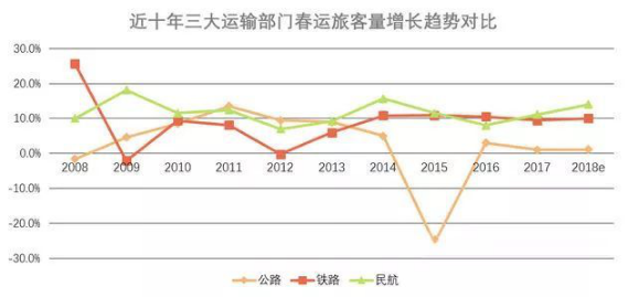图1:近十年三大运输部门春运旅客量增长趋势对比
