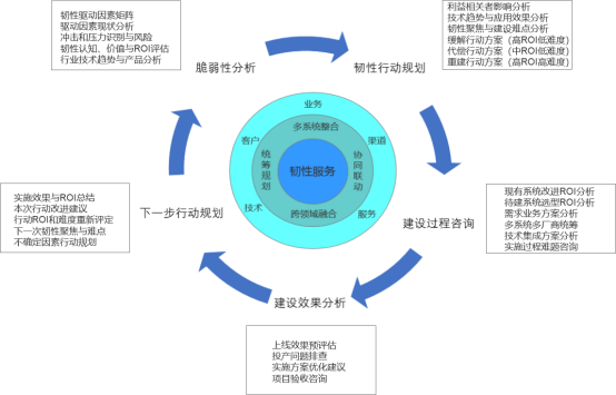 韧性服务强调有效面对日常服务压力和各种应急突发事件综合考量,在充分评估ROI和行业产品现状的基础上,因地制宜进行韧性服务评估,为解决难题带来新思路、新做法和新模式,可包含以下内容:
