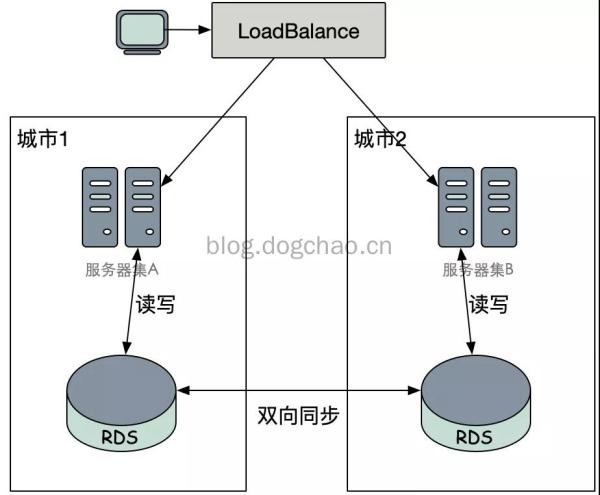 上图是一个简单的异地双活的示意图。流量经过 LB 后分发到两个城市的服务器集群中,服务器集群只连接本地的数据库集群,只有当本地的所有数据库集群均不能访问,才 failover 到异地的数据库集群中。