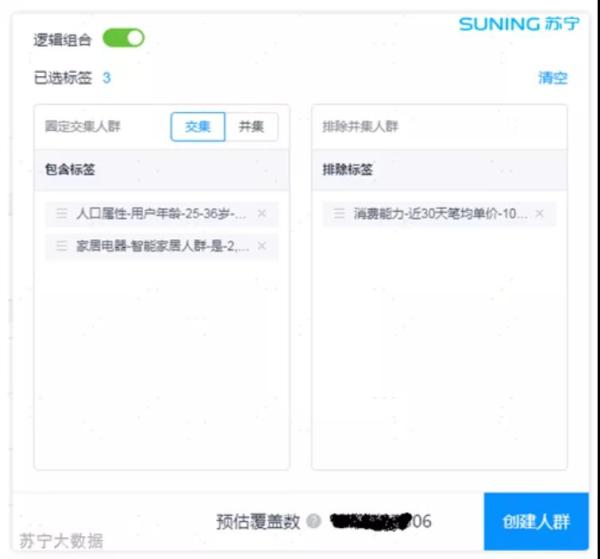 上图的标签选择的含义为:“用户年龄范围为 25-36 岁”并且为“智能家居特征”的人群,排除最近 30 天消费小于 10 元的人群。
