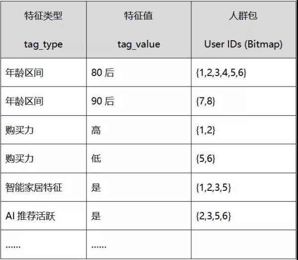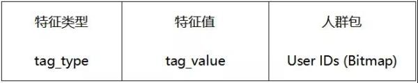 将一个特征值下的 userid 集合做为 Bitmap 对象存储到一条记录中,一条记录的内容如下: