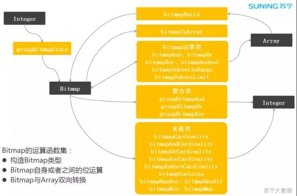 围绕 Bitmap 对象实现了一套完善的计算函数。Bitmap 对象有两种构建方式,一种是从聚合函数 groupBitmap 构建,另一种是从 Array 对象构建,也可以将 Bitmap 对象转换为 Array 对象。