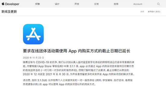 苹果公司在其开发者博客上写道:“尽管根据App Store Review3.1.1准则的规定,应用需要通过应用内购买功能提供任何收费的在线群组活动体验,但我们暂时推迟了这一原定最后期限为2020年12月的规定。为了让企业有更多时间开发应用内购买解决方案,最后期限已被延长至2021年6月30日。”