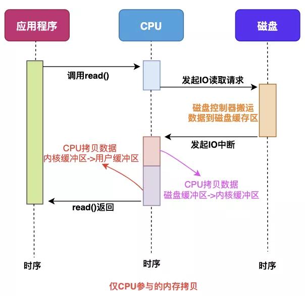 CPU 收到磁盘控制器的 I/O 中断之后,开始拷贝数据,完成之后 read() 返回,再从内核态切换到用户态。