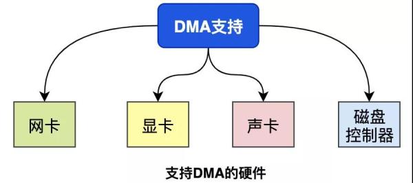 目前支持 DMA 的硬件包括:网卡、声卡、显卡、磁盘控制器等。