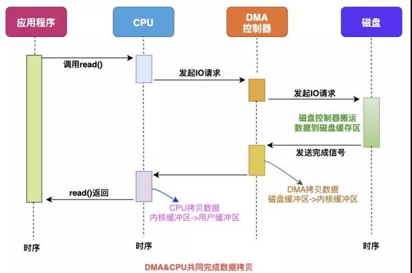 最主要的变化是,CPU 不再和磁盘直接交互,而是 DMA 和磁盘交互并且将数据从磁盘缓冲区拷贝到内核缓冲区,之后的过程类似。