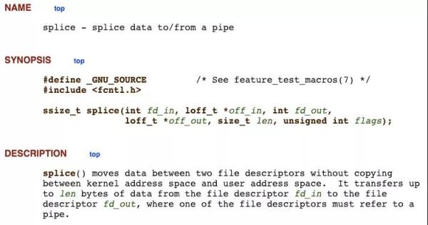 splice 系统调用是 Linux 在 2.6 版本引入的,其不需要硬件支持,并且不再限定于 socket 上,实现两个普通文件之间的数据零拷贝。