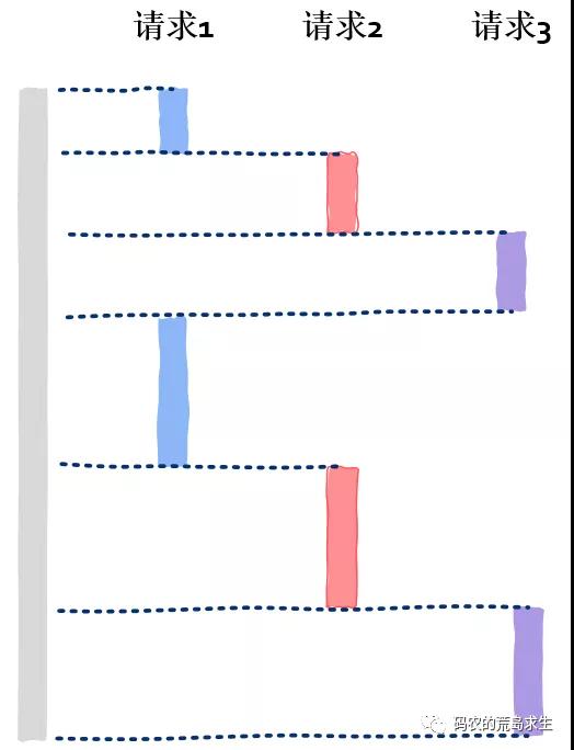 我们可以为每个请求创建一个线程,即使一个线程因执行I/O操作——比如读取数据库等——被阻塞暂停运行也不会影响到其它线程,就像这样:
