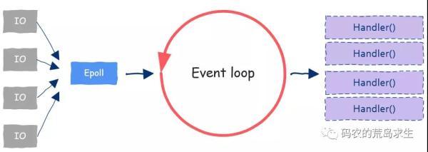 这样IO多路复用技术就成了event loop的原材料供应商,源源不断的给我们提供各种event,这样关于event来源的问题就解决了。