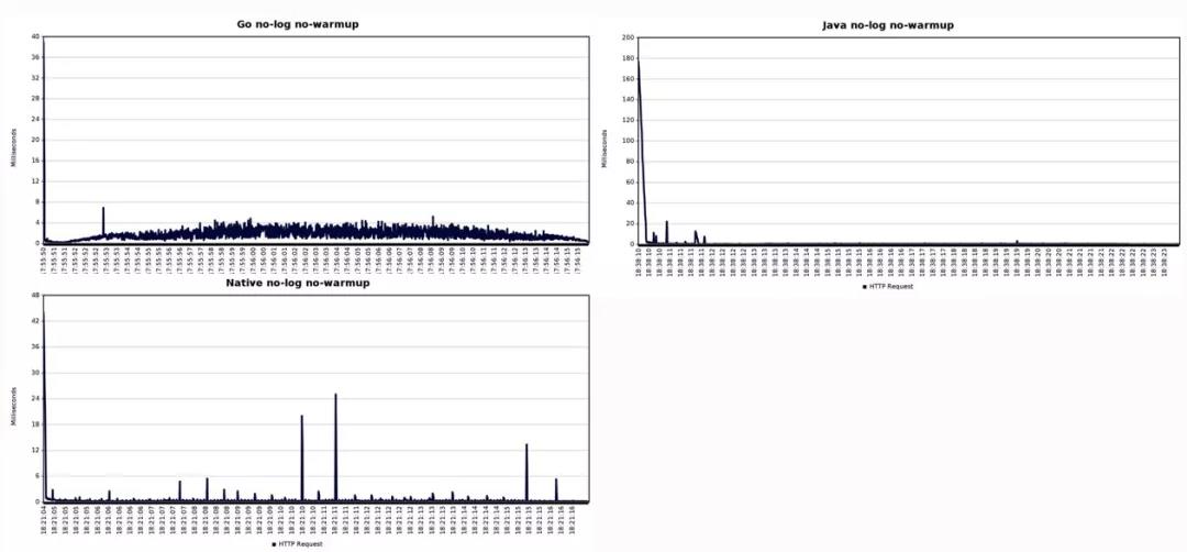 请注意,在所有三种 Java 变体当中,第一批请求的响应时间要长得多(蓝线相较于左轴的高度)而且在各项测试中,我们还看到一些峰值,其可能是由垃圾收集或优化所引起。