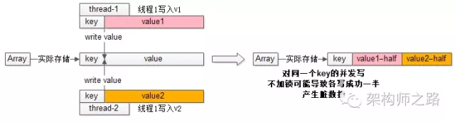 不加锁,线程1和线程2对同一个定长区域进行一个并发的写操作,可能每个线程写成功一半,导致出现脏数据产生,最终的结果即不是value1也不是value2,而是一个乱七八糟的不符合预期的值value-unexpected;