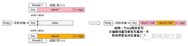 (3)如果不加锁,线程1和线程2对同一个定长区域进行一个并发的写操作,可能每个线程写成功一半,导致出现脏数据产生,最终的结果即不是value1也不是value2,而是一个乱七八糟的不符合预期的值value-unexpected,但签名,一定是v1-sign或者v2-sign中的任意一个;