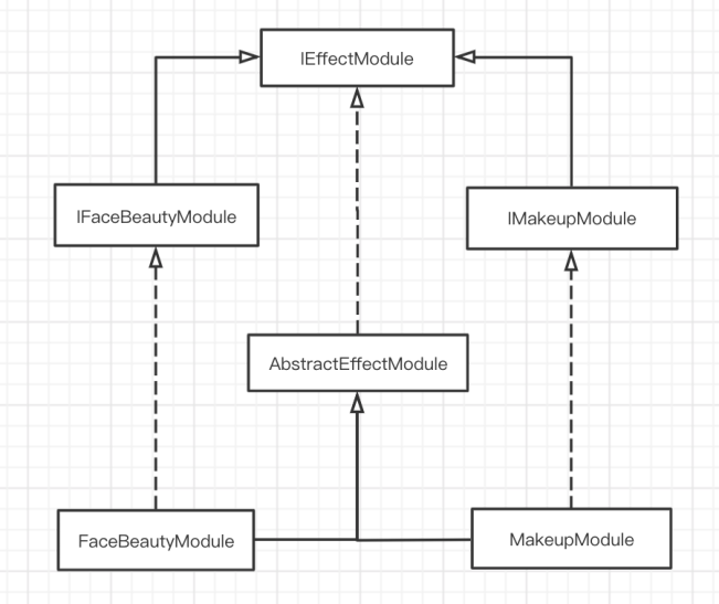 • 定义美颜 IFaceBeautyModule 接口,其继承 IEffectModule 接口,包括额外的设置参数操作,FaceBeautyModule 作为其实现类,同时继承 AbstractEffectModule,复用基类的代码。