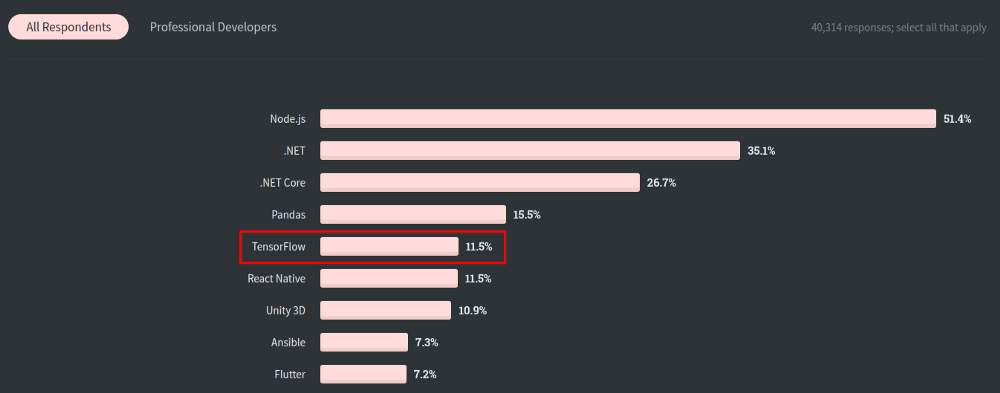 出自谷歌的TensorFlow是深度学习领域的领先的库,但是 2016 年 Facebook 发布了 PyTorch 后一切都发生了变化。PyTorch使用动态图而不是(TensorFlow 使用的)静态图,并且对 Python 更加友好。作为回应,谷歌在 2019 年创建了 TensorFlow 2.0,复制了 PyTorch 的很多功能(动态图、对 Python 友好)。它还与谷歌的Collab完美结合(Collab 是一款非常现代且功能强大的笔记本)。从那时起,谷歌的 TensorFlow 2.0 就越来越受欢迎。目前,根据 Stack Overflow 开发者调研 2020,TensorFlow 是最流行的深度学习框架: