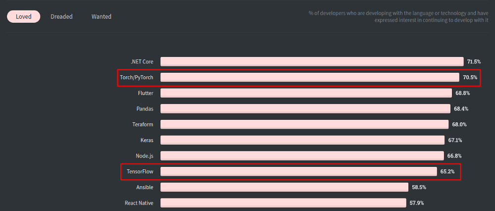 另一方面,开发人员喜欢用 PyTorch 工作,它以更好的开发人员工效学而更受开发人员的喜爱: