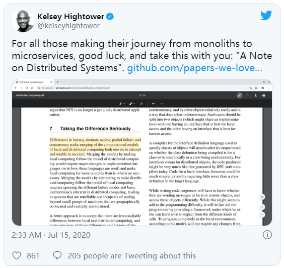 最近,由于微服务架构的复杂性和在某些用例中的失败,人们对它产生了强烈的反感。Kelsey Hightower在下面的推特中总结了对微服务的批评: