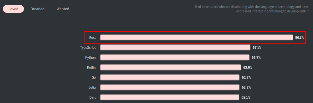 其中,随着行业的注意,Rust 将在 2021 年取得突破。在过去 5 年中,根据 Stack Overflow 开发者调研,它是最受喜爱的编程语言: