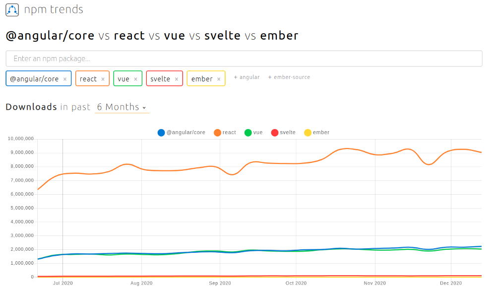 如下图所示,React 是目前下载量最多的客户端 JavaScript 框架: