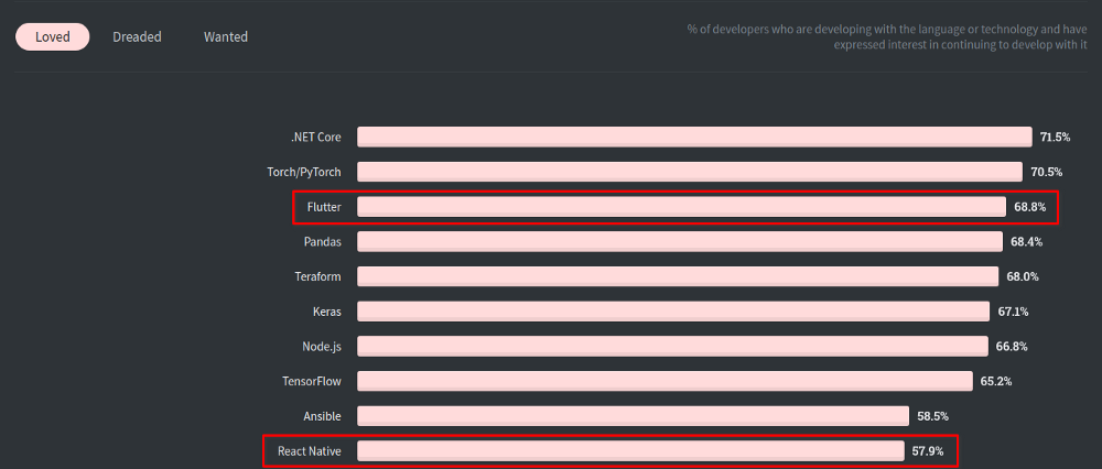 谷歌的Flutter是一个相对比较新的框架,但近年来非常流行。它提供了一个功能强大的 UI 工具箱,用来从单一代码库构建漂亮的原生编译的移动、桌面和 Web 应用程序。然而,Flutter 还不像 React 那样是 Web 开发中的主流框架。Flutter 使用了一种现代编程语言——Dart,一种快速发展的效率非常高的编程语言。就性能而言,Flutter 比 React 有优势。它还提供了更好的开发者工效学,而且开发人员喜欢使用 Flutter 工作: