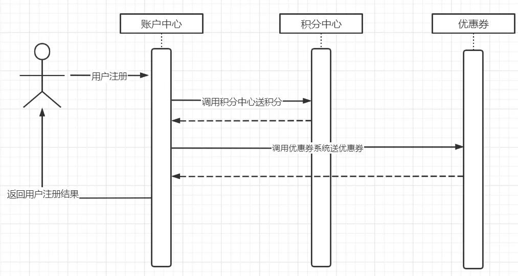 举一个最简单的场景:新用户注册送积分、送优惠券场景,其原始架构设计通常如下: