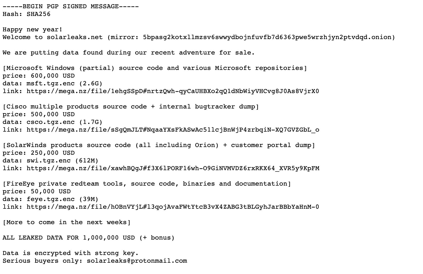 [Microsoft Windows (partial) source code and various Microsoft repositories]price: 600,000 USDdata: msft.tgz.enc (2.6G)link: https://mega.nz/file/1ehgSSpD#nrtzQwh-qyCaUHBXo2qQ1dNbWiyVHCvg8J0As8VjrX0[Cisco multiple products source code + internal bugtracker dump]price: 500,000 USDdata: csco.tgz.enc (1.7G)link: https://mega.nz/file/sSgQmJLT#NqaaYXsFkASwAc51lcjBnWjP4zrbqiN-XQ7GVZGbL_o[SolarWinds products source code (all including Orion) + customer portal dump]price: 250,000 USDdata: swi.tgz.enc (612M)link: https://mega.nz/file/xawhBQgJ#f3X6lPORF16wh-O9GiNVMVDZ6rxRKX64_XVR5y9KpFM[FireEye private redteam tools, source code, binaries and documentation]price: 50,000 USDdata: feye.tgz.enc (39M)link: https://mega.nz/file/hOBnVYjL#l3qojAvaFWtYtcB3vX4ZABG3tBLGyhJarBBbYaHnM-0