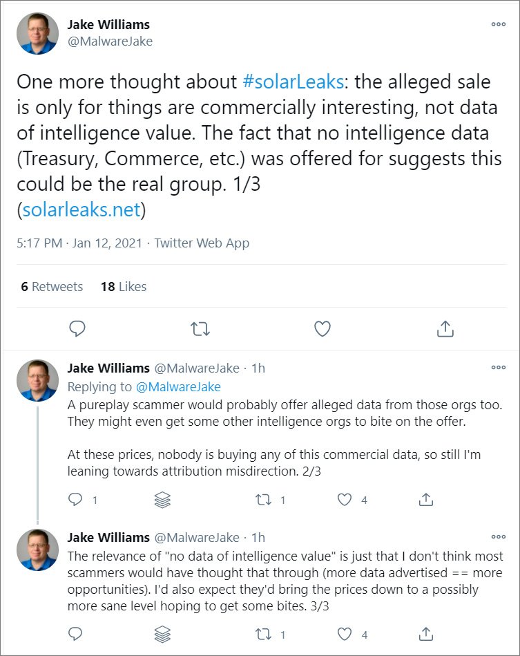网络安全公司 Rendition Infosec 的 CEO Jake Williams 认为,目前被出售的数据倾向于有商业价值的数据,而不是从政府机构窃取的情报,这表明发起 SolarWinds 攻击的应该是真实的黑客组织。