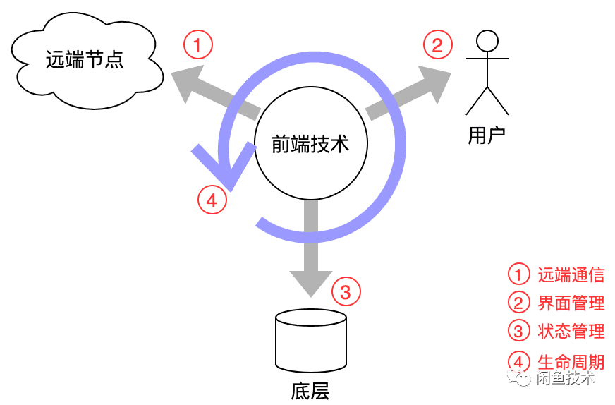 前端技术是用户(人)与设备的粘合剂,让二者有机的构成一个网络节点。我尝试剖析下前端技术在节点中的形态:首先它需要提供界面给用户,并响应用户的交互;需要管理和远端节点的通信,交换信息;还需要管理当前节点的信息状态;最后,为了方便的嵌入到网络中,节点需要一个友好的“外观”,就是生命周期。生命周期描述了节点的诞生,消亡,所拥有的权益,和所承担的责任。