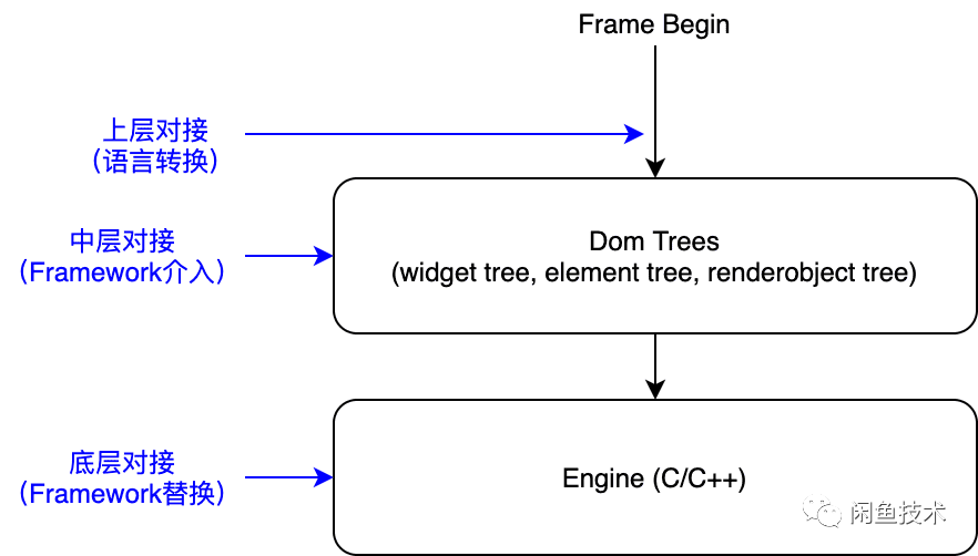 •底层 Framework 替换,整个替换掉 Flutter Framework, 直接使用底层的 Engine。