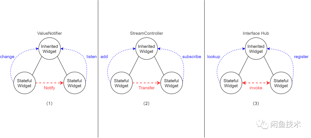 Notify型:通知/监听模式,Flutter提供了ValueNotifier和ChangeNotifier, 简单方便,适用于轻量信息通信,参见Provider