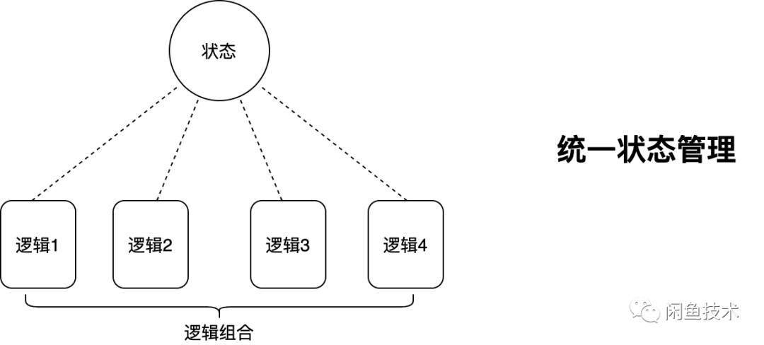 •状态不拆,拆分逻辑: 这种做法的特点全局共用一个状态结构体对象,所有状态全部放在这个对象中,叫做“统一状态管理”。只有一个数据对象,就消除了各个处理逻辑之间信息共享问题,逻辑内部没有状态,变得非常的纯粹(比如纯函数来实现),再将逻辑以合适的方式组合成一个整体,实现上界限清晰,简单优雅,代表的方案就是 Redux。