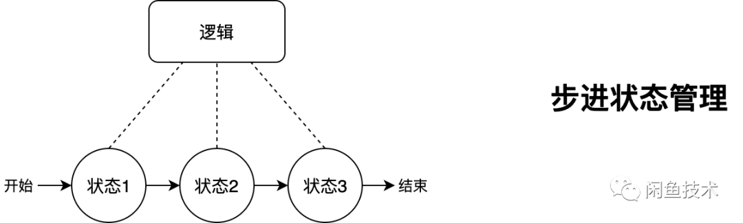 •逻辑不拆,拆分状态: 我把这种叫做“步进状态管理”,实际上这类似于状态机模式。但如果要真正使用,状态必须是有限的,而且不能经常变动。这与互联网持续多变的业务需求实际是不符合的,所以采用这种方式的设计几乎没有。但在一些很严肃的业务场景中,比如交易流程,一旦定下来就不容易变动。这时,步进状态管理就很合适了。
