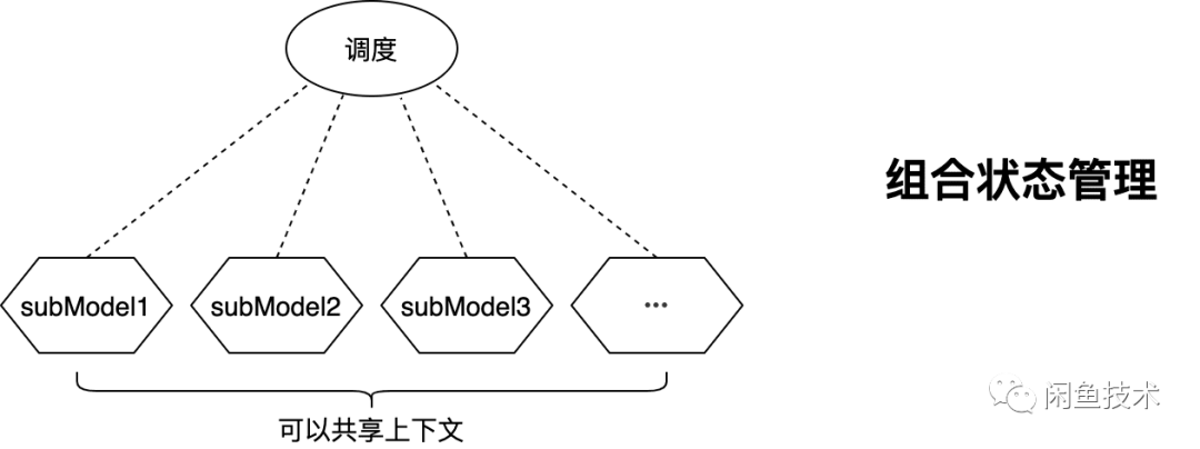 •同时拆分逻辑和状态: 这是容易想到方案,在更细的粒度上,将状态和它对应的处理逻辑拆分打包,变成更小的域(scope),然后统一协调这些子域(subModel),我把这种叫做“组合状态管理”。进一步的方案可以统一定义 subModel 的基础行为,然后引入调度器来协调管理它们,subModel 之间还可以共享上下文来共享信息等等。