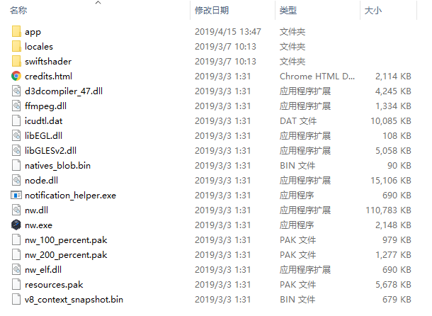 然后将app文件夹下的所有文件项目文件压缩成app.zip的压缩文件,将其更改为app.nw文件。将app.nw从app中粘贴到根目录中,然后 打开命令行工具合并成exe文件:
