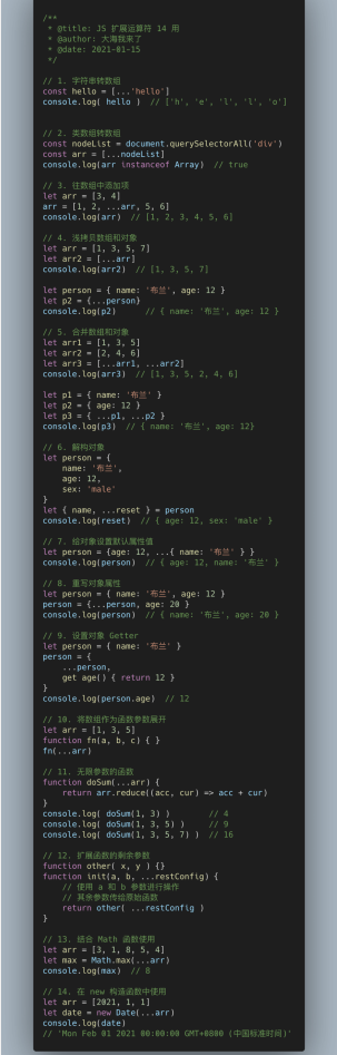 而实际上,它也就是这么用的,但是如果事情有这么简单,就不用我在这里写了。扩展操作符给我最大的印象就是,这玩意还挺方便的,然而最近写代码的时候经常性的遇到需要使用扩展操作符的场景,所以我干脆在网上找了些资料,把平时常见的应用场景给罗列了下,发现这个操作符是真的强大,有多强大?来看看下面这些用法吧。
