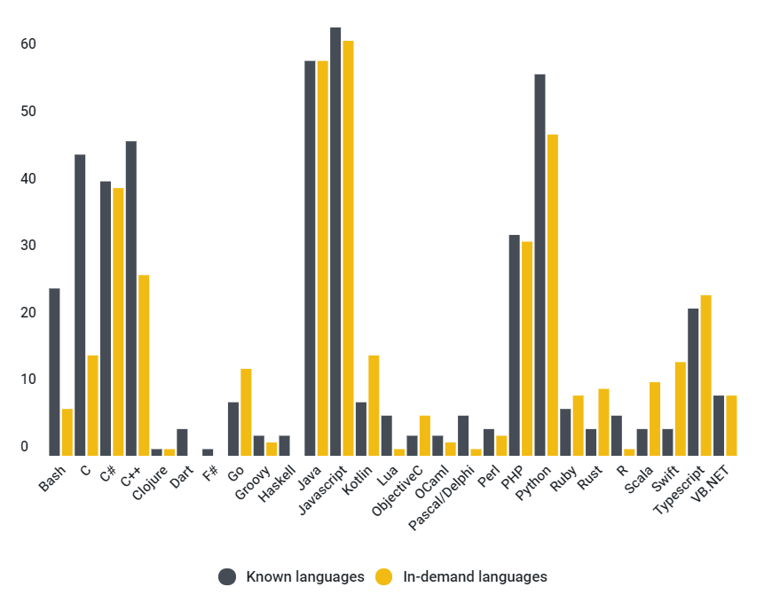 同样,有 47% 的受访者使用 C++ 进行编程,但只有不到三分之一(27%)的公司表示需要 C++ 开发人员。对于 Python 来说也是如此:有 57% 的开发人员使用该语言进行编程,但只有不到一半的公司对此有很高的需求。