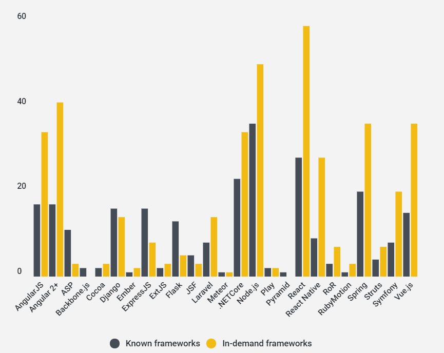 另一个高人气框架是 Angular2。有 41% 的招聘者表示正在寻找 Angular2+ 专家,然而也只有 16.9% 的开发人员表示他们知道这个框架。