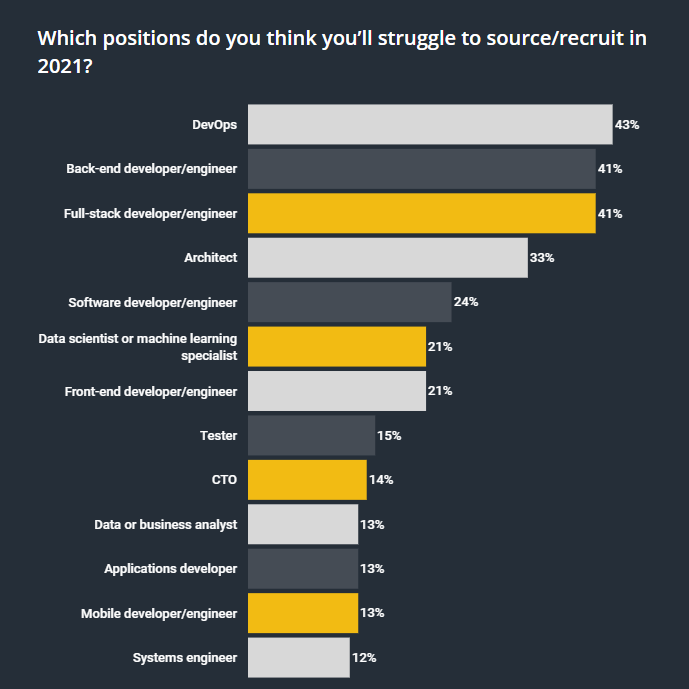 鉴于 DevOps 的需求量之大,有 43% 的受访 HR 表示,今年他们将很难为自己的技术团队找到合格的 DevOps 专业人员。调查结果显示,它已经超越后端和全栈开发人员,成为 2021 年最难填补的职位。
