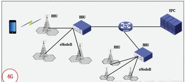4G时代到来时,基站架构发生了较大的变化。为了降低端到端时延,4G采用了扁平化的网络架构。将原来的3级网络架构“扁平化”为2级:eNodeB-核心网。RNC的功能一部分分割在eNodeB中,一部分移至核心网中。4G核心网只包含PS域。