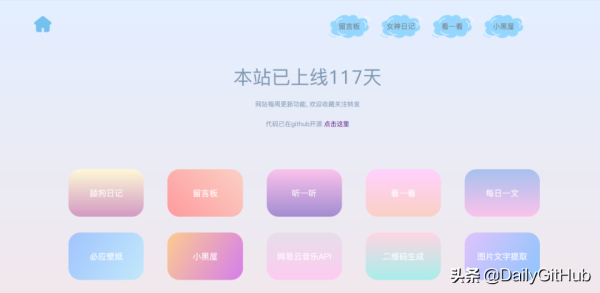 目前功能:舔狗日记、听歌音乐抖动粒子、每日一文、壁纸、网易云API、JSON格式化、二维码生成、颜色转换、图片文字提取