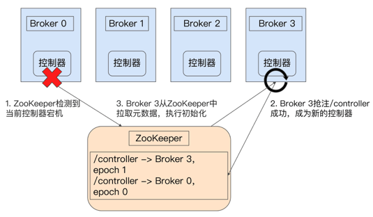 只有一个 Broker 当控制器,单点失效,立即启用备用控制器