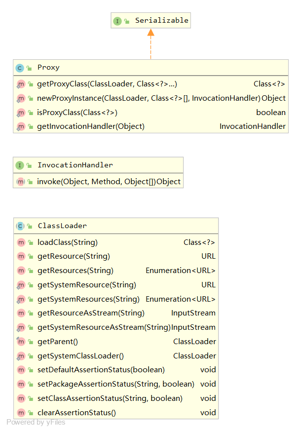 java.lang.ClassLoader:这是类装载器类,负责将类的字节码装载到 Java 虚拟机(JVM)中并为其定义类对象,然后该类才能被使用。Proxy 静态方法生成动态代理类同样需要通过类装载器来进行装载才能使用,它与普通类的唯一区别就是其字节码是由 JVM 在 运行时动态生成 的而非预存在于任何一个 .class 文件中。