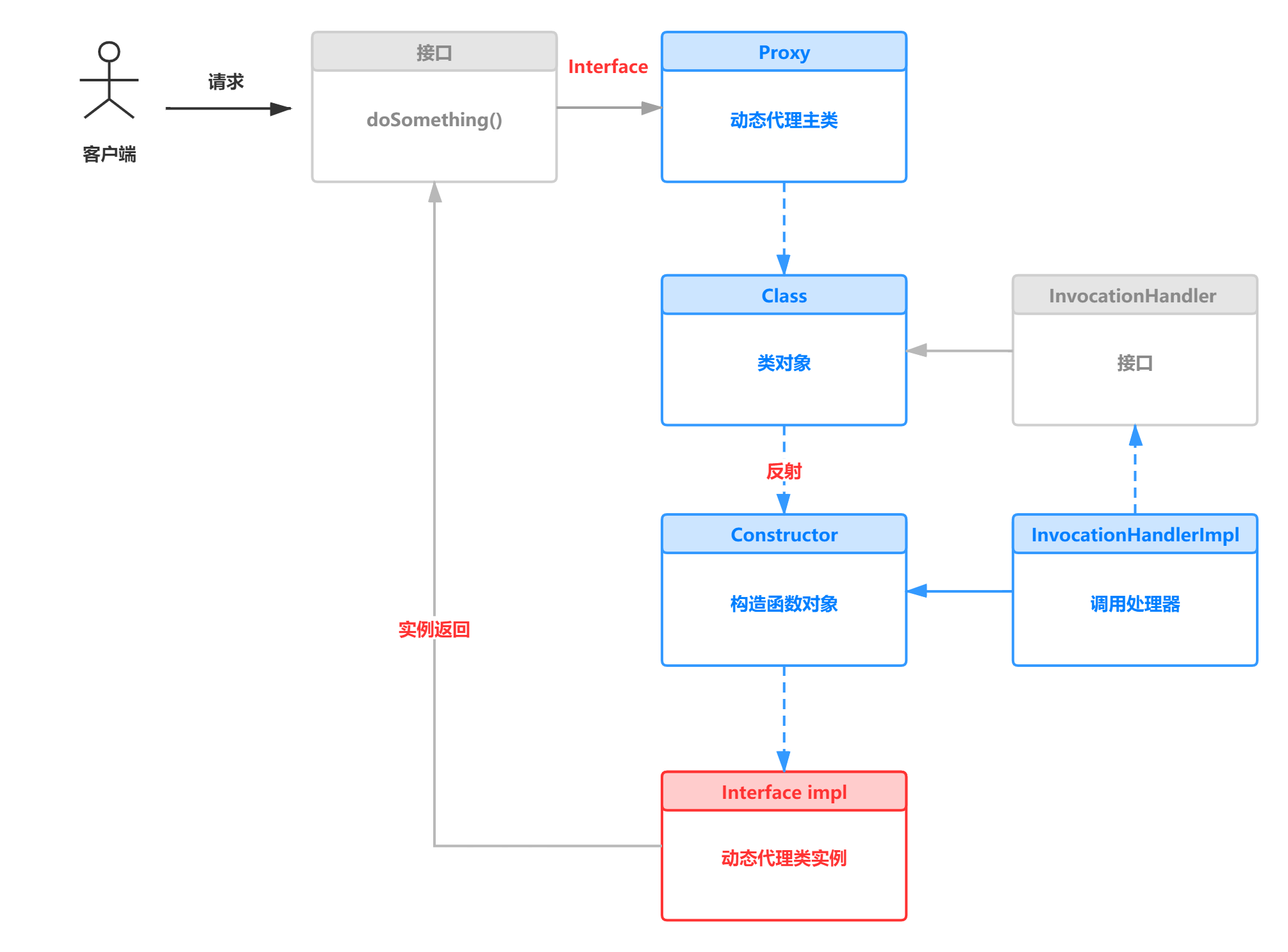 // InvocationHandlerImpl 实现了 InvocationHandler 接口,// 并能实现方法调用从代理类到委托类的分派转发// 其内部通常包含指向委托类实例的引用,// 用于真正执行分派转发过来的方法调用InvocationHandler handler = new InvocationHandlerImpl(..);// 通过 Proxy 为包括 Interface 接口在内的一组接口// 动态创建代理类的类对象Class clazz = Proxy.getProxyClass( classLoader, new Class[] { Interface.class, ... });// 通过反射从生成的类对象获得构造函数对象Constructor constructor = clazz.getConstructor( new Class[] { InvocationHandler.class });// 通过构造函数对象创建动态代理类实例Interface Proxy = (Interface)constructor.newInstance( new Object[] { handler });