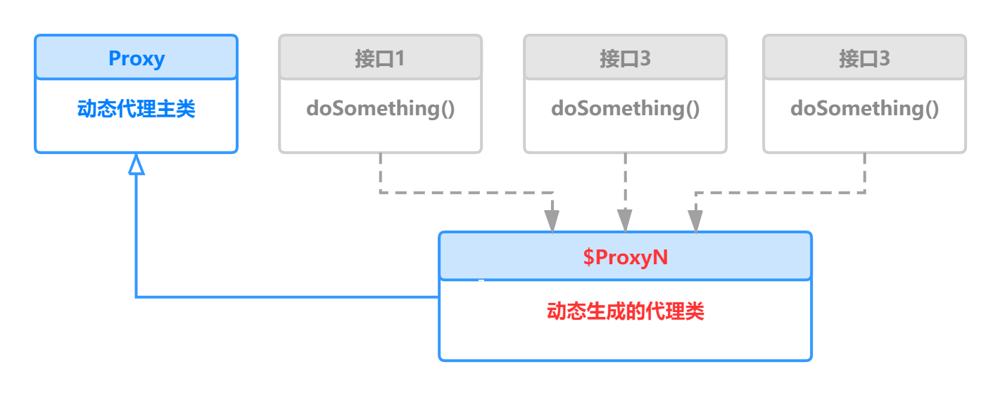 由图可见,Proxy 类是它的父类,这个规则适用于所有由 Proxy 创建的动态代理类。而且该类还实现了其所代理的一组接口,这就是为什么它能够被安全地类型转换到其所代理的某接口的根本原因。