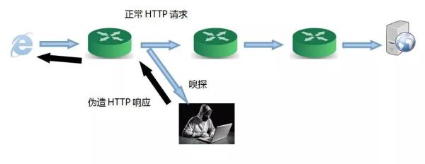 HTTP劫持相对于DNS劫持温和一些。在服务器与客户端进行数据传输时,攻击者伪装成服务器,响应客户端请求,从而抛弃真正服务器的数据传输。