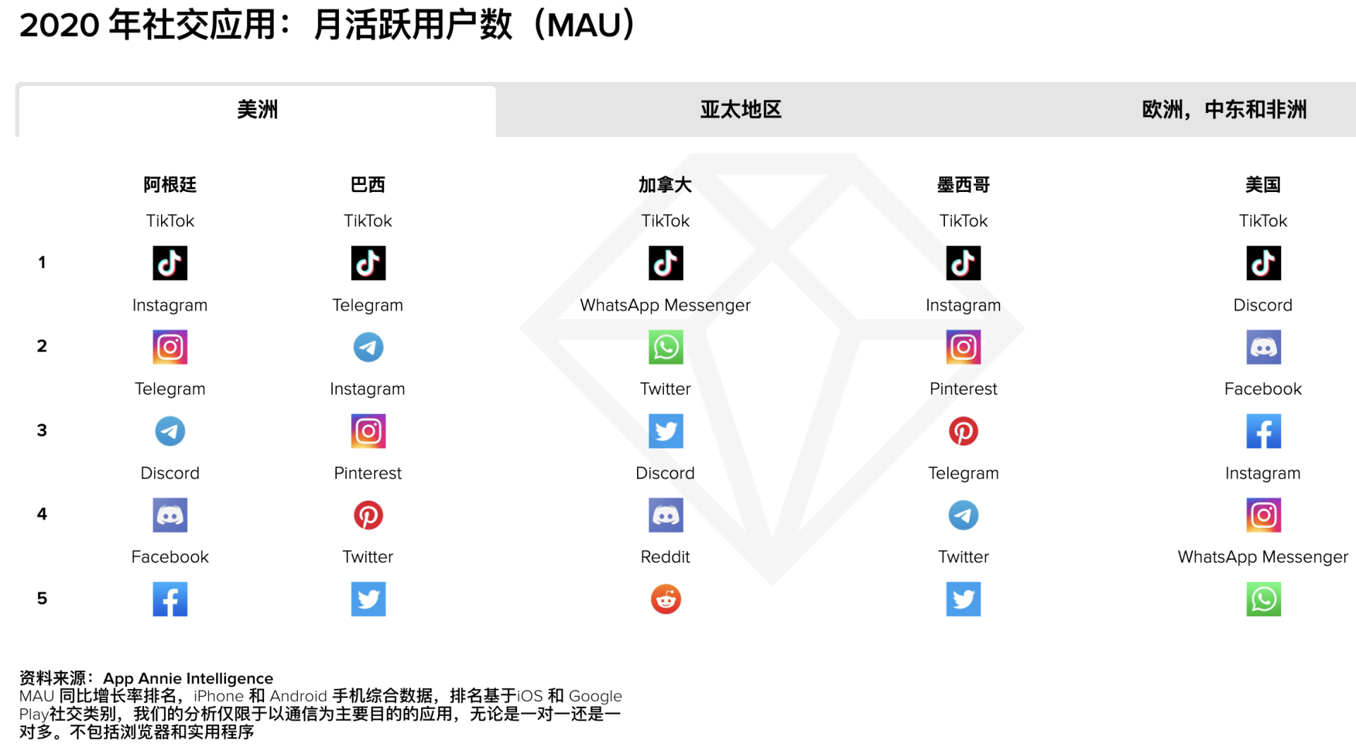 TikTok 在使用时长排行榜中排名前 5,其用户平均每月使用时长增长速度几乎比其他所有应用都快,在美国达到 70%,在英国达到 80%。预计 2021 年 TikTok 的活跃用户数有望达到 12 亿。