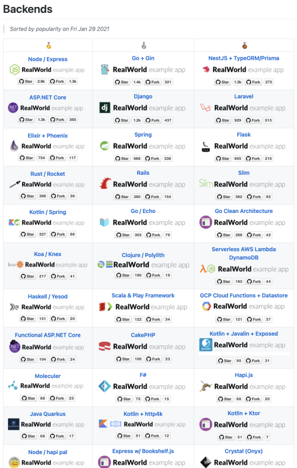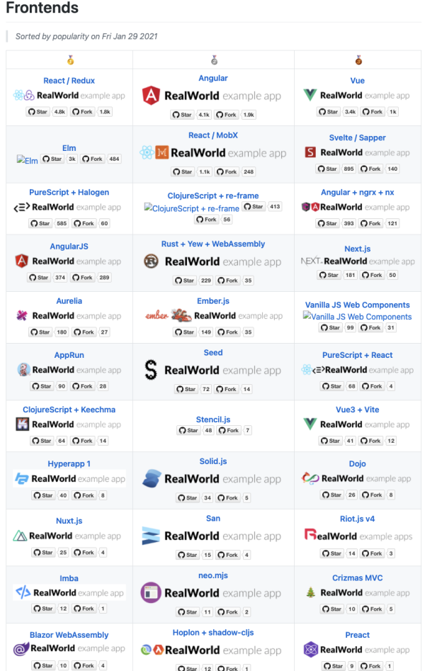 这就是为你准备的 GitHub 仓库!这超出了典型的“ to-do”应用程序, RealWorld 的示例使整个 “Medium-style” 应用程序更加丰富,包括了所有的钟声、哨声和最佳实践!