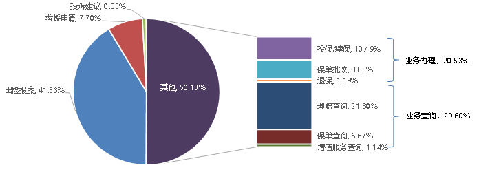 以某财产保险公司呼叫中心为例,呼入业务类型有五大类,为出险报案、救援申请、投诉建议、业务办理(投保、批改、退保)、业务查询(保单、理赔、增值服务等查询),根据来电量占比分别为41.33%、7.70%、0.83%、20.53%及29.60%(图1);在这所有业务类型中对客户的来电目的进行初步分析,尝试将呼入类型中占比合计50%的“业务办理”和“业务查询”加入邀请客户添加企业微信的话术,这是对客户进行服务营销的前提和入口。